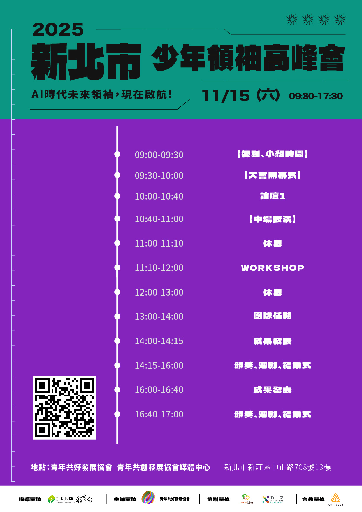 二、為培養青少年因應AI時代的核心素養,本局與「青年共好發展協會」合作,以「AI時代未來領袖,現在啟航!」為主軸,規劃論壇、實作工作坊及團隊任務等多元形式,讓學生於真實情境中學習思辨、協作與創新,進而啟發自我覺察與社會影響力,為未來多元領袖養成奠定基礎。